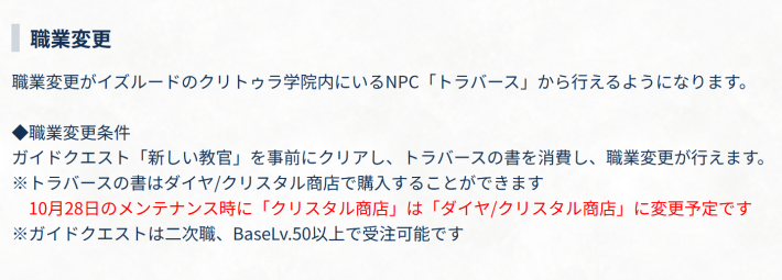 職業変更には、トラバースの書というアイテムが必要です。各街にあるダイヤ/クリスタル商店で購入できるので、職業変更をする際には購入しておきましょう。