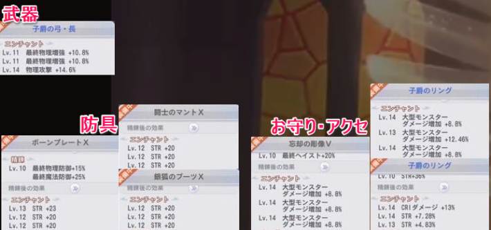 | 碑文 | STR=CRI=>CRダメージ>DEX>ASPD>物理増強 PVP効果 物理ダメージ軽減デバフ軽減=状態異常 |