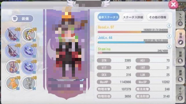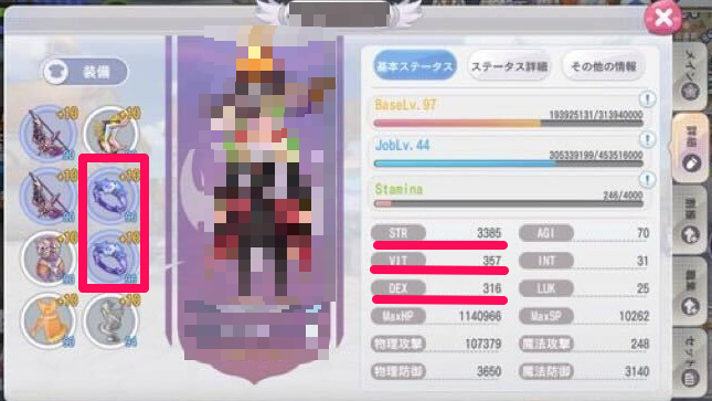 弓装備のローグ系はSTRで火力が上がるため、アクセやカードなどでSTRを高く盛っています。クリティカルメインですが、CRIはカード等で盛っているのでLUKは強化をしていません。
