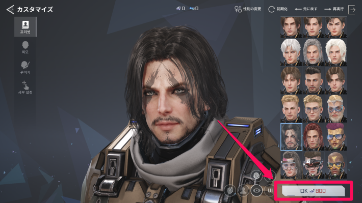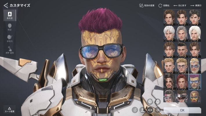 バイオスーツ選択後のキャラメイク画面では、髪型や肌色など、かなり細部まで作り込むことが可能です。また、項目ごとにカラーやグラデーションなどもあるので、オリジナリティの高いキャラメイクができます。