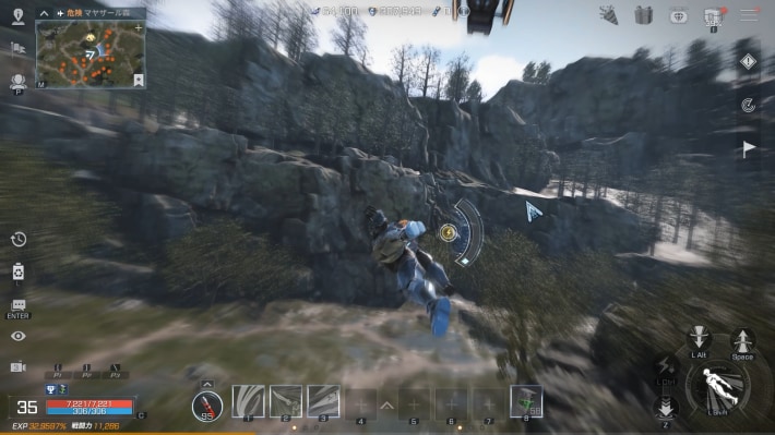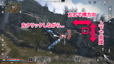 空中での移動は、前進方向への移動入力のみ速いスピードで移動が可能です。左右や後方への移動にも前進方向キー入力を織り交ぜることで、空中での自由度が格段に上がります。