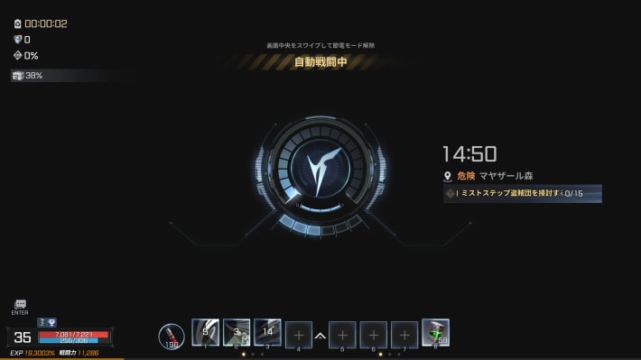 節電モード中でもスキャン範囲内の敵と自動戦闘ができ、経験値やアイテムを獲得できます。端末の充電残量が気になる場合などに活用しましょう。