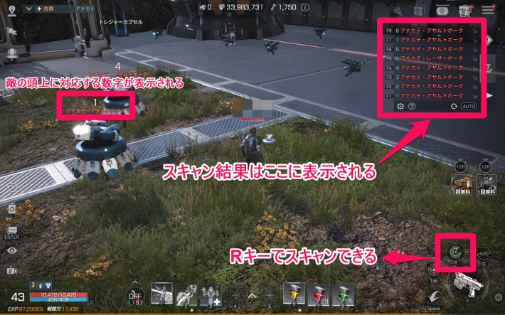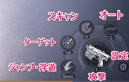 レーダーアイコンで周囲の敵を手動でスキャンして付近の情報を一気に知ることができます。その後対応するキーを選択することで、攻撃などの行動に移ることができます。