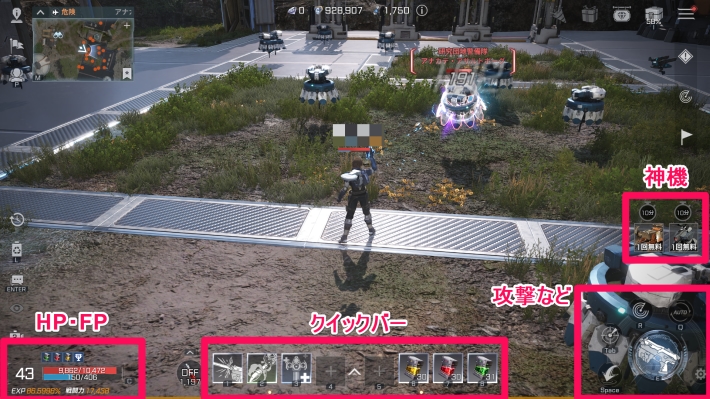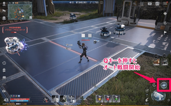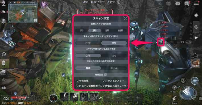 「AUTO」をタップすると周囲の敵を自動スキャンし、オート戦闘が始まります。近くの敵を優先して攻撃を行うため、経験値稼ぎにもおすすめです。