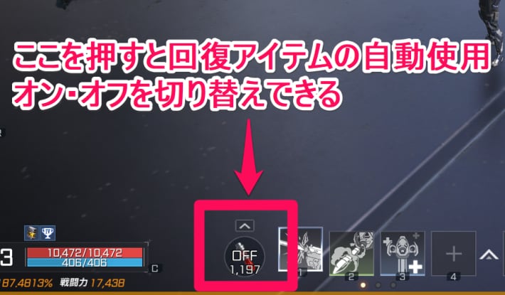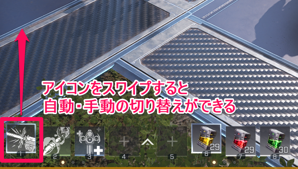 対応するボタンやキーを押すことでクイックバーに登録したスキルやアイテムを使用できます。アイコンを上にスワイプすることで、自動・手動で使用するかを切り替え可能です。