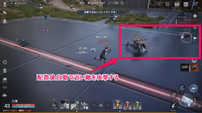 フィールドに出した後、近い敵を自動攻撃し始めます。ランチャーもプレイヤーとは別のステータスを持っているため、プレイヤーの攻撃力を上げたからといってランチャーの火力が上がるわけではありません。