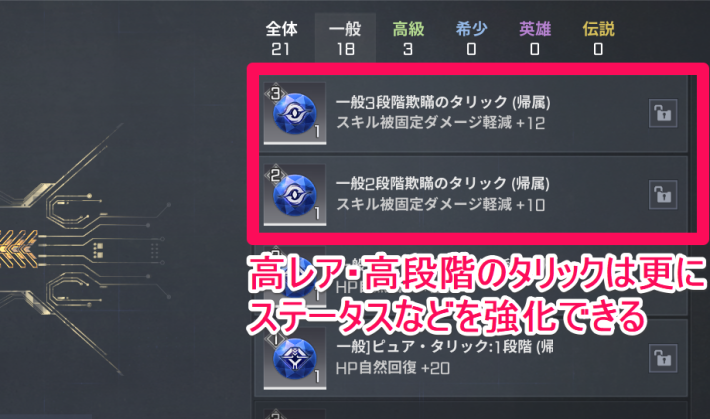 装備にタリックを着用することで、装備のステータスをさらに強化できます。タリックは各ダンジョンの報酬で入手可能です。