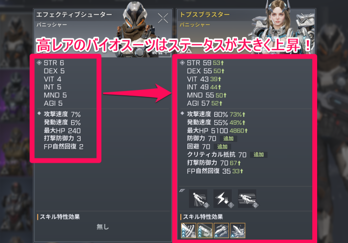 Point! | 獲得したバイオスーツの種類によっても、キャラクターの戦力が強化できます! |