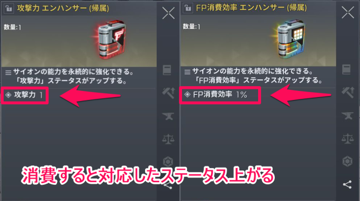 実績などで手に入るエンハンサーは、消費することで対応するステータスを永続的にアップします。手に入り次第ステータスを強化しましょう。