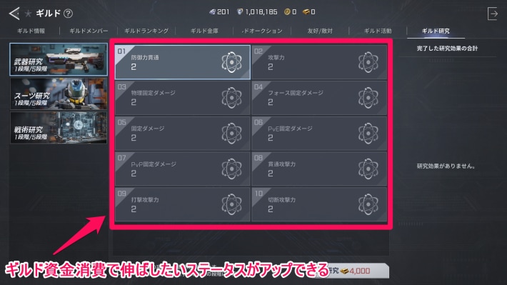 ギルドに加入後、ギルド資金を消費してギルド研究が行えます。伸び幅は小さいですが、キャラを強化できる要素となっています。
