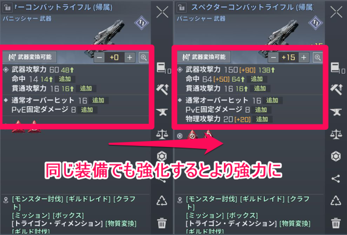 同じ装備でも強化アイテムを使用してレベルを上げれば、さらに強力になります。