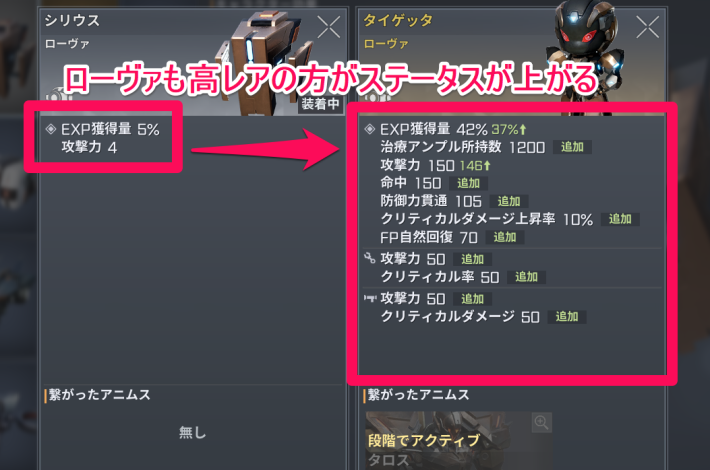 ローヴァを装備するとステータスや獲得EXPが増加します。バイオスーツとは異なるステータスが上がるため、戦力強化における重要な要素です。