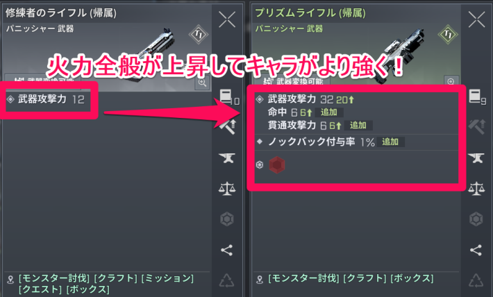 より強力な装備に変更することで、武器は攻撃力、装備は耐久力を向上させます。