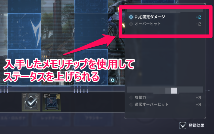 獲得したメモリチップを登録することでも、ステータスがわずかに上昇します。ダンジョンなどの報酬を確認して、欲しいチップがある場合は優先的にクリアを目指しましょう。