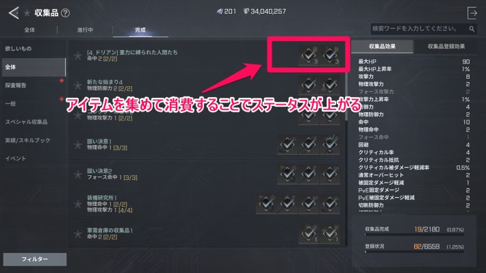 クエスト報酬やモンスターを倒したときのドロップ素材を収集品として登録することでステータスが上昇します。一度登録した収集品は戻ってこないため、登録前に現在仕様している装備ではないか確認しましょう。