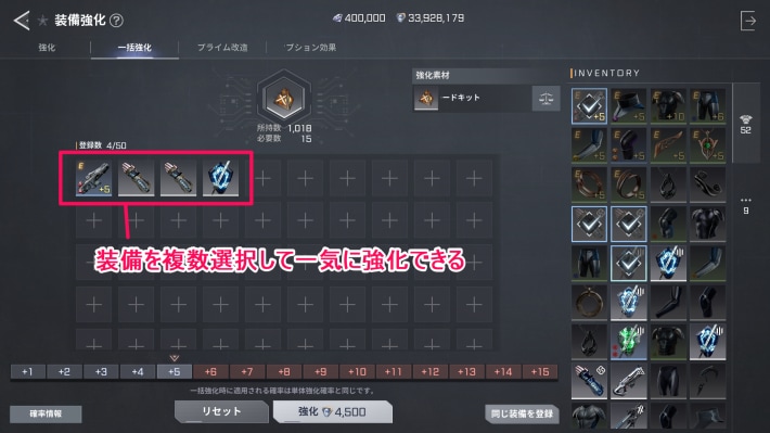 複数の装備を強化したいときは装備強化▶一括強化から装備をまとめて強化することができます。