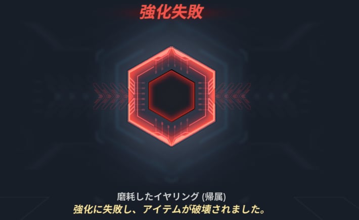 装備は強化失敗すると壊れてしまい強化の元となった武器や防具は無くなります。装備が壊れると強化に使用したクラフト素材が返還されるため、次の装備の強化を行うことができます。