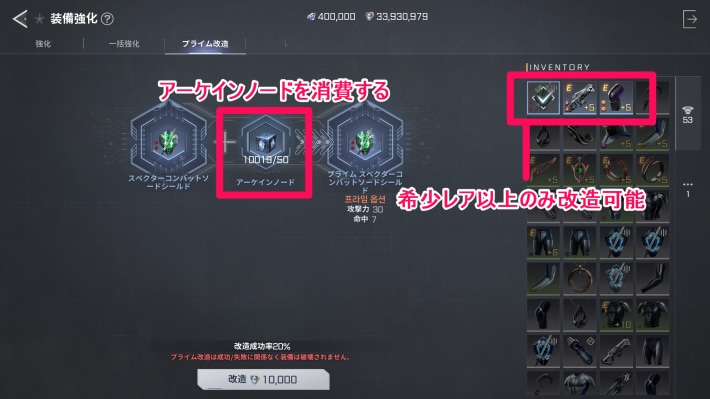 アーケインノードと希少以上のレア度の装備を用いることで、プライム改造が行えます。改造成功時には、1段階性能の高いプライムオプションが追加で付与された「プライム装備」が手に入ります。