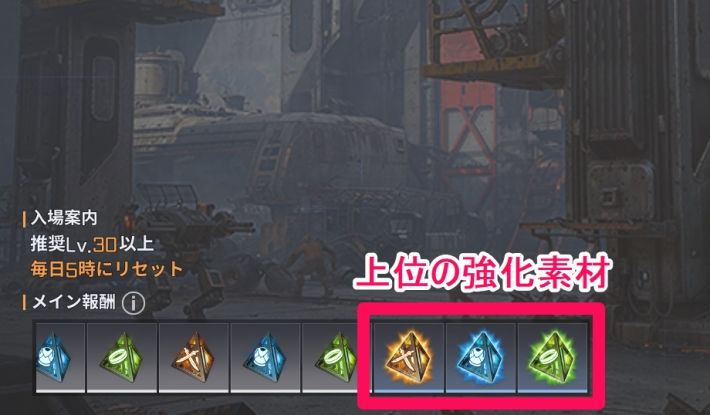 レベル上げ素材はエリアダンジョンのアンドロイド廃棄所で入手するのがおすすめです。ダンジョンは1日当たりの入場時間に制限があるため、毎日欠かさず挑戦しましょう。