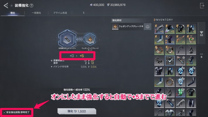 強化画面の左下にあるチェックを入れて装備を選ぶと、強化段階(レベル)が5になるまで素材を消費して自動で強化できます。