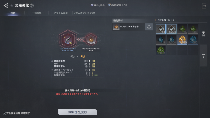 装備を強化する際、成功率がレベルごとに決められています。成功率は強化段階+5から徐々に低下するため、完全に強化を行うには非常に多くの素材が必要です。