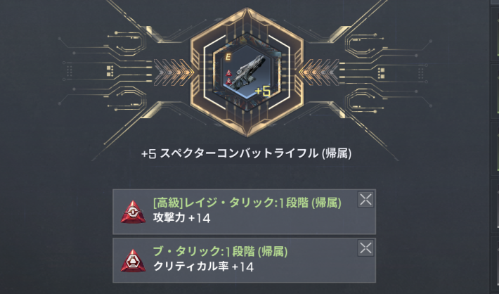 タリック枠のある装備にタリックを装備すると、さらに装備を強化することができます。タリックは主にダンジョンのバイオスーツ訓練モードやクエストクリアなどで入手できます。