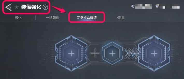 メニューから装備強化画面を選び、タブをプライム改造に切り返すことで改造を行えます。