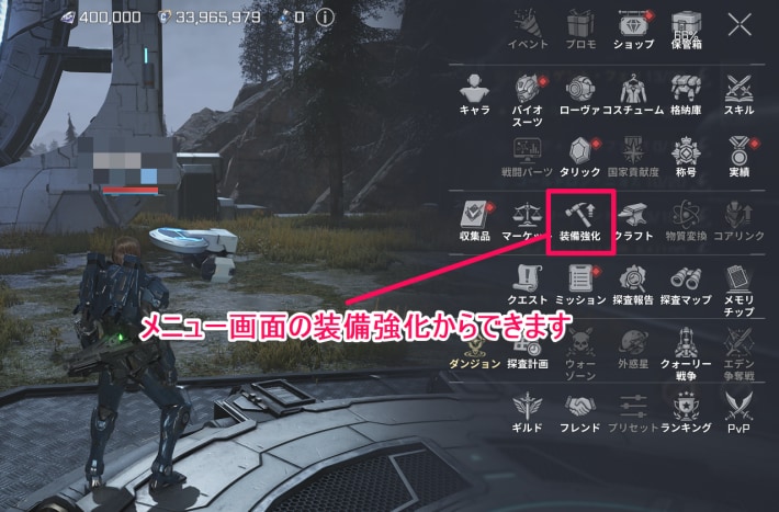 武器や防具の強化は、メニュー▶装備強化から武器や装備の強化を行えます。