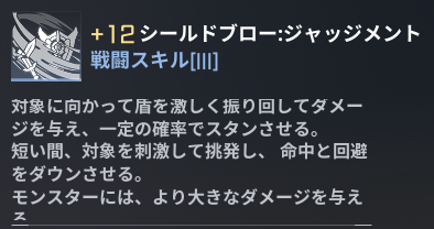 シールドブロー | スタン 《挑発》 《命中率デバフ》 《回避デバフ》 《攻撃力・クリ率・回避デバフ》 |