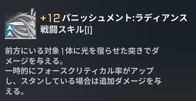 序盤からある「パニッシュメント」は+4でクリティカル率アップ、+8でスタン状態の相手に追加ダメージ、+12は両方の効果があります。攻撃力を伸ばすなら、状態異常系とクリティカル系を上げても良いでしょう。戦闘スキルⅤなどでも、強い攻撃手段を得られます。