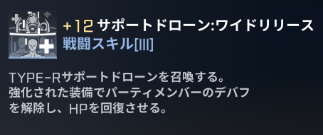 初期スキルでは、希少グレードの「サポートドローン」が回復系スキルですが、パーティメンバー全員を回復させるには、+8以上にアドオンする必要があります。回復役としてチームへ貢献するには、ある程度の育成が必要です。