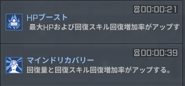 | 【カテゴリ】強化スキル 【消費FP】60 【クールタイム】70秒 【適用効果】 最大HP 200 回復スキル回復上昇率 3% 効果時間 90秒 最大HPと回復スキル回復上昇率がアップする。 | |