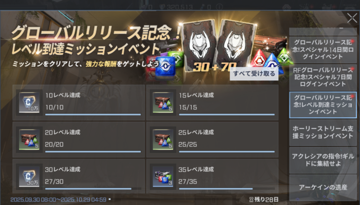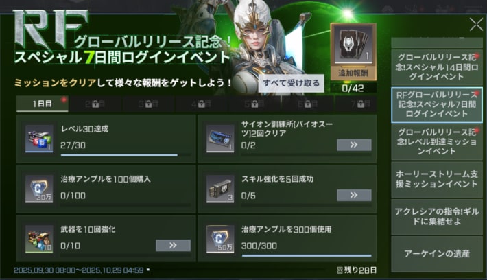 グローバルリリースを記念し、 7日間のミッションイベントが開催中です。 イベント期間内にすべてのミッションを達成し、ローヴァ召喚チケットやバイオスーツ召喚チケットなどをGETしましょう!