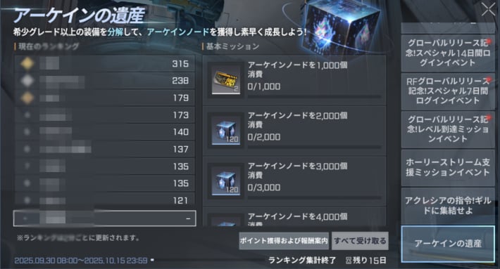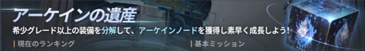 新イベント「アーケインの遺産」が開催中です。イベントミッションをクリアや装備分解による点数を稼いでランキング上位を目指しましょう。ランキング上位者にはバイオスーツのガチャチケットが配布されます!