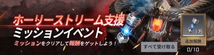 期間中、すべてのミッションを完了すると総30,000個のホーリーストリームを手に入れることができる「ホーリーストーム支援ミッション」が実施中です。フィールドモンスターやダンジョンでモンスターを倒してミッションをクリアしましょう!