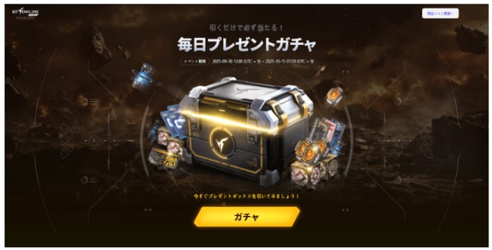 ![]() | 【開催期間】 ~10/15(水)07:59まで ▶︎毎日プレゼントガチャ |