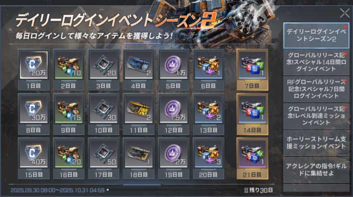 傭兵の皆様の成長と戦闘の一助となるように特別な「デイリーログインボーナス」イベントが開催中です。 イベント期間中、毎日ゲームにログインして、豪華な報酬を手に入れましょう。