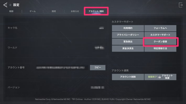 クーポン登録に必要な会員番号(PID)はゲーム内の設定ボタン(歯車マーク)を選択して、ゲーム設定画面内【アカウント/規約】メニューにあるアカウント番号を入力しましょう。