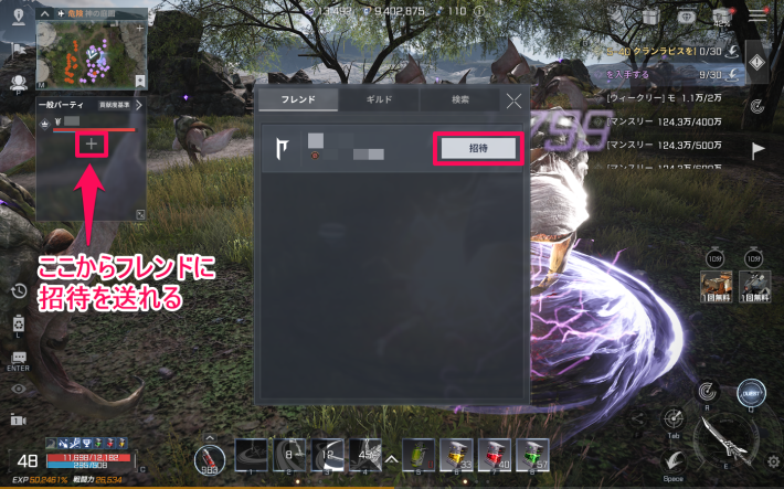 フレンドはどこでもパーティ招待が可能で、招待することで居場所や残りHP、FPを確認可能です。