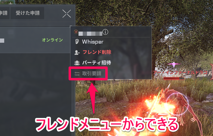 フレンドであればフレンドメニューから個人取引を要請でき、遠くに居てもアイテムをトレード可能です。