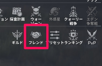 メニュー▶フレンドからフレンドメニューを開き、申請を行います。