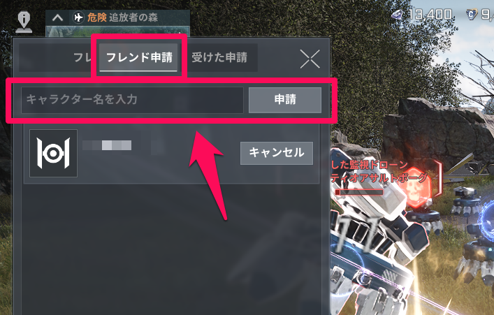 フレンドメニューのフレンド申請タブから名前を入力して申請を送信します。
