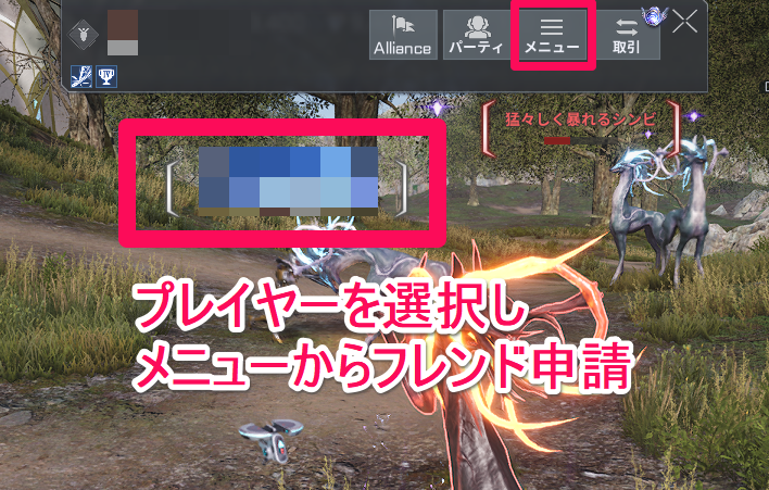 フレンド申請したいプレイヤー名を選択し、画面上部のメニューから申請を行います。