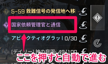 国家クエストが発生したらクエスト▶国家タブのクエスト受注で受注し、画面の右上の発生しているイベントを選択し、自動で目的地に行きクエストを進行していってくれます。
