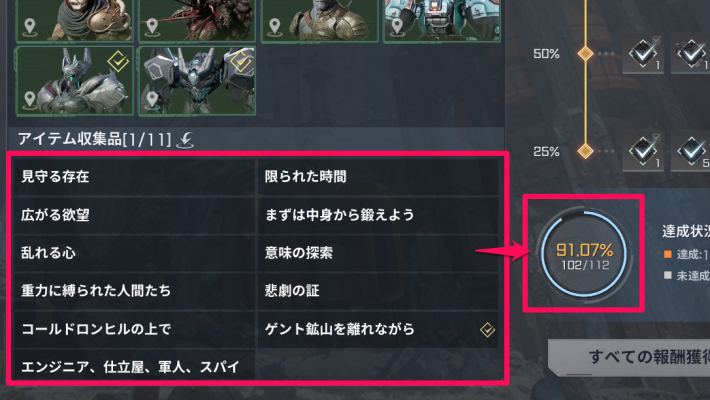 収集品を集めると、集めた地域のエリア達成率が上昇します。達成度報酬などが貰えるため、エリアごとに収集していくことも1つの手段です。