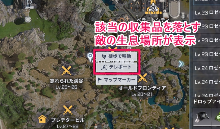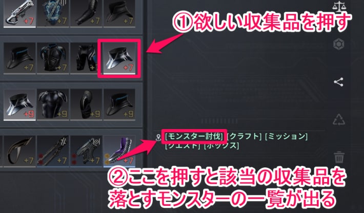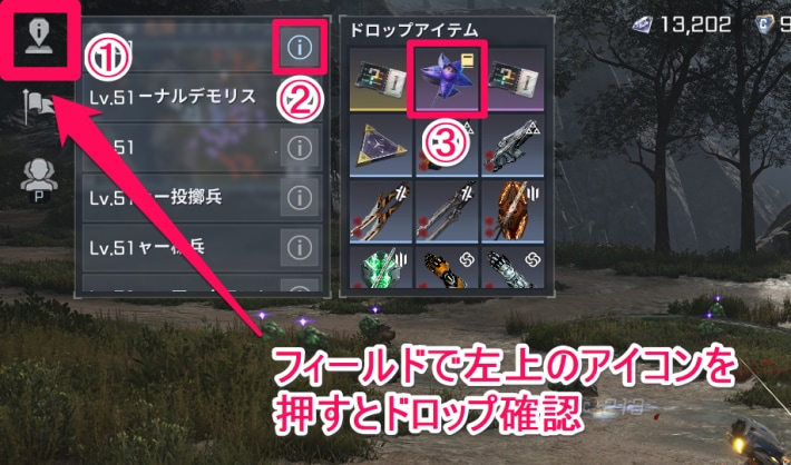 敵がいるフィールドで左上のアイコンから敵一覧を開き、丸アイコンを押すと今いるエリアの敵のドロップ品を確認できます。