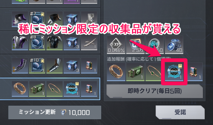デイリー/ウィークリーミッションをクリアすると稀に収集品が貰えます。効率よく集めたい場合は収集品が報酬に含まれているミッションを優先的に選択しましょう。