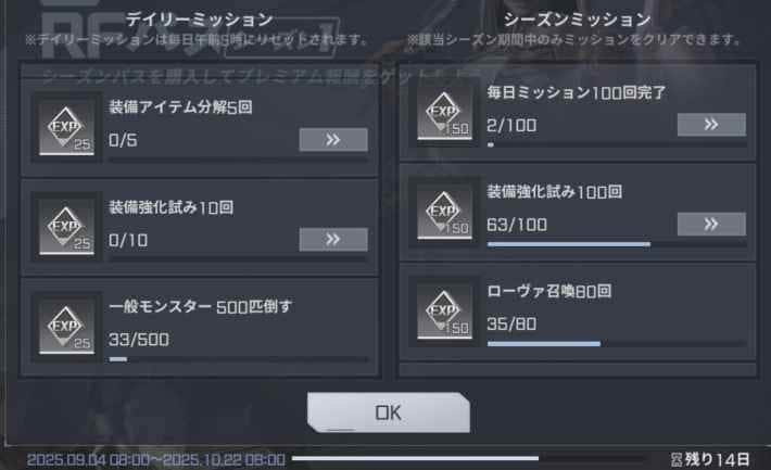 デイリーミッションでおすすめなのは、装備アイテムを5回獲得/装備アイテムを5回分解/モンスターを500匹倒す/「ミッション」のデイリーを8回クリアです。4つともシーズンミッションと共通しているため、探査報告などを活用しオート戦闘することで自然と達成できます。