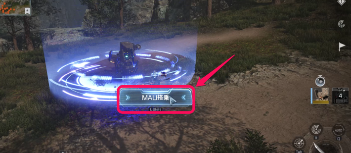 出撃したMAUに近づくことで、搭乗が可能となります。画面中央に出現するボタンをタップするか、PCの場合はL Shiftでも搭乗ができます。