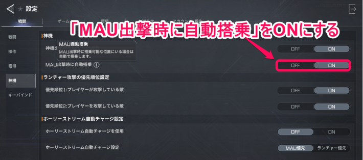 画面右上のメニューから設定>神機と進むと、MAU関連の設定ができます。「MAU出撃時に自動搭乗」をONにすることでMAU出撃時に搭乗可能な位置にいる場合は自動で搭乗するようになります。
